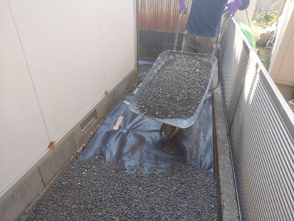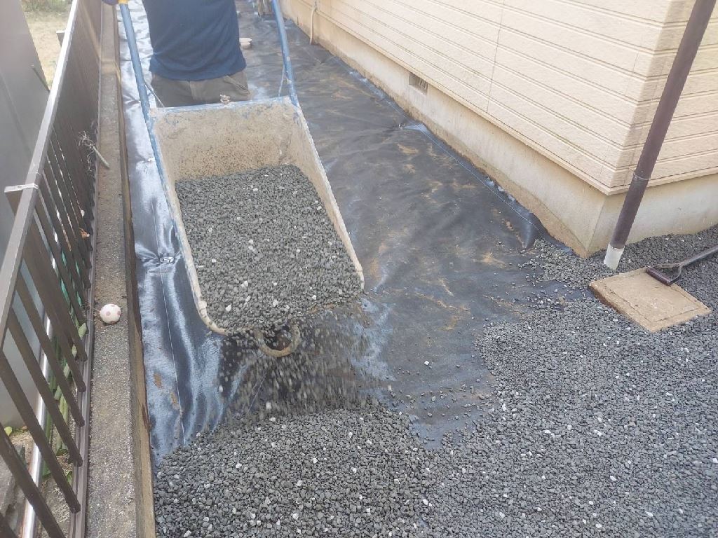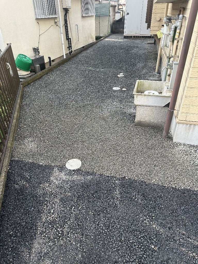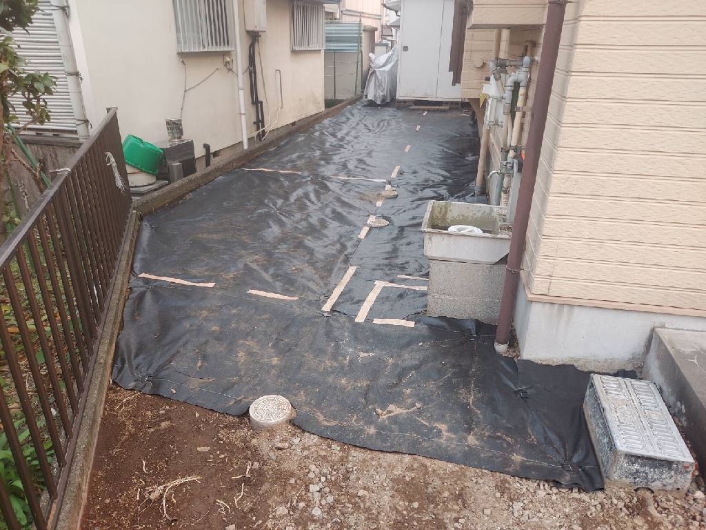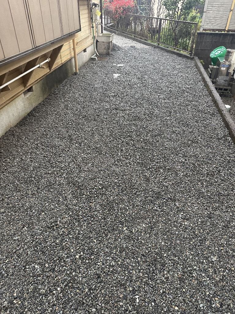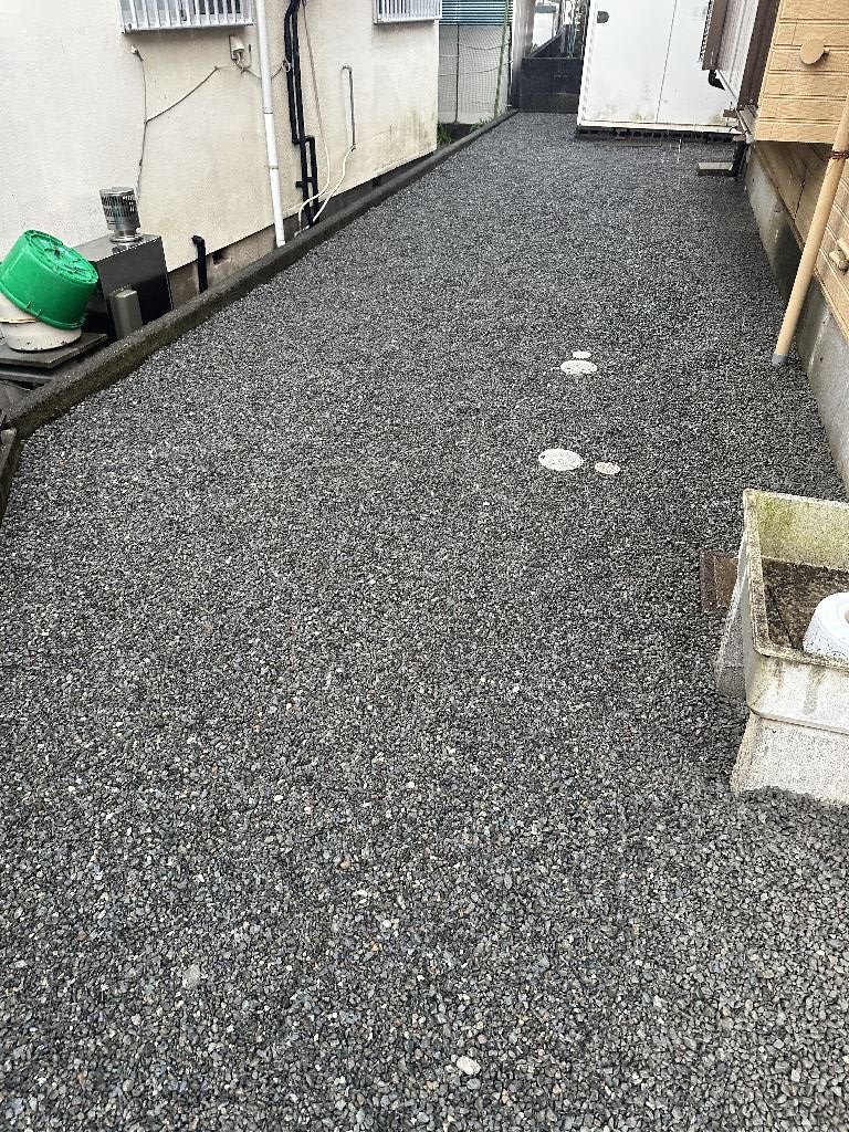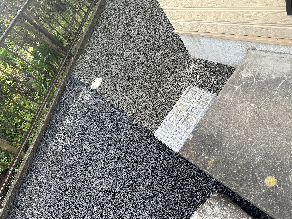 本当に四季から、二季になってしまったような気候。お客様・職人・自分とで、何度か?水の流れ方(勾配・排水)について、検討を実施しながら工事を進めました。以前から、玄関を出て乗車するまでの泥濘で汚れることと、雑草の手入れが嫌なことを最優先した結果。このようになりました。
