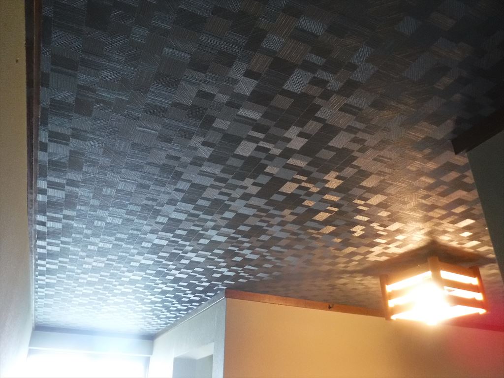 2Fの廊下天井は白いクロスだったのですが、全くイメージを変更したいとこの柄にされました。