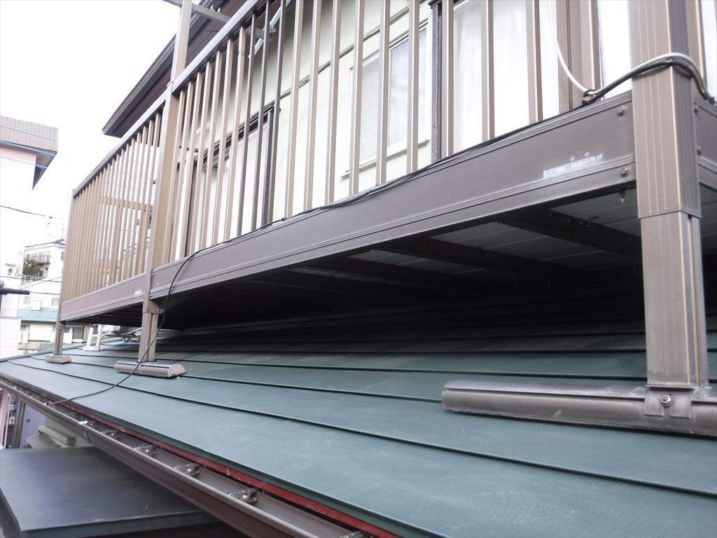 ここのところの大雨の量がスゴくて、大変な雨漏りだったそうです。本当に雨漏りすると気持ちも落ち込みますよね・・・築50年ぐらいの建物。屋根の下地がバーティクルボード(木材チップを熱で圧着した板)を使用されている家があります。話によると石油ショックで板が手に入りづらく、代わりに使っていた板だとか・・・?この板は水にとても弱く。粉々になって大変なことになった現場もございます⇒http://reformnohiroba.com/seko/15362.html こういった現場は早く対応しないと大変なことになりますからね・・・・とても怖いので、下屋根工事用だけの足場を架設してから、大屋根用の足場も架設することに致しました。テラスデッキ(ベランダの床)の仮置き場を足場に設置しました。置く場所に困るんですよねぇ・・・