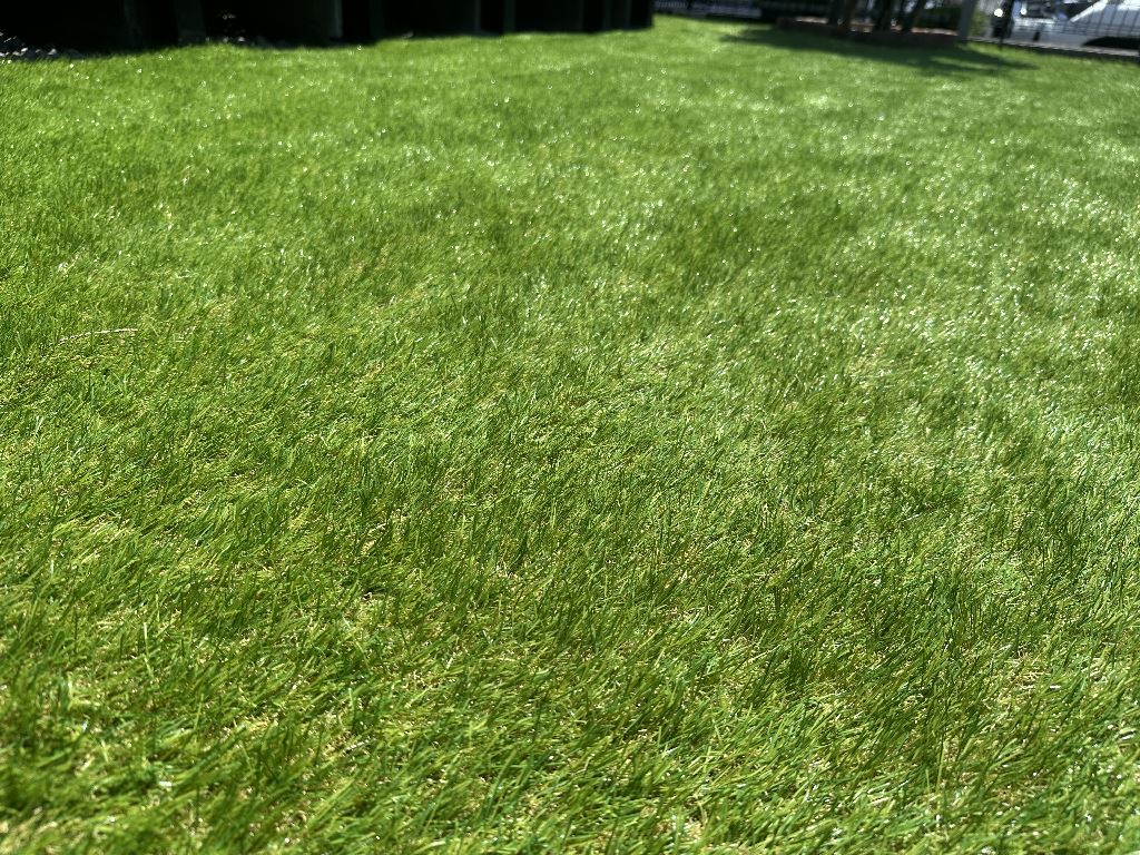 いろいろと要望がございましたが、この人工芝には拘りました!長さ38mmの人工芝にして、きっちりと敷きました。ただ・・・人工芝の寿命というのが、だいたい8年ぐらいなんですよね。それに合わせて下に敷いた防草シートも耐久8年のものにしました。
