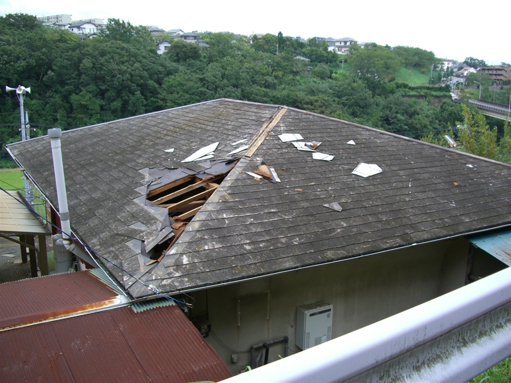 大変です!屋根が破壊されました!と、聞いて駆けつけたところ、本当に吹き飛んでいるのに驚きました。