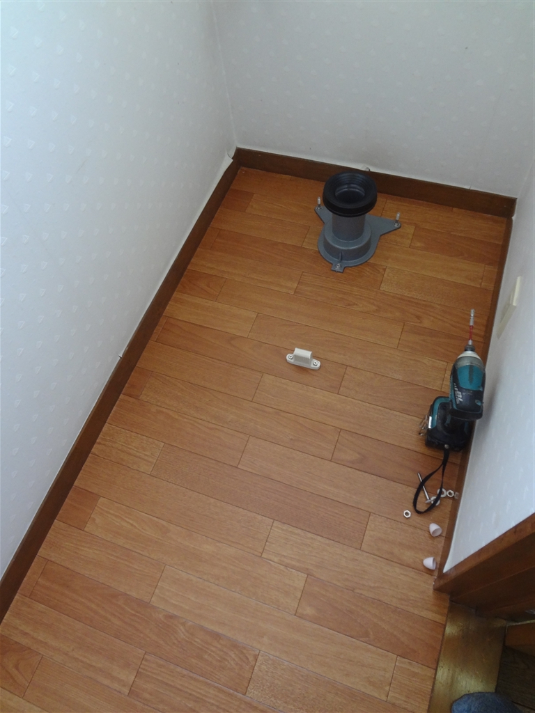 | 工事内容 | トイレ撤去 ⇒ 給排水設備 ⇒ 床補修 ⇒ CF(クッションフロア)貼り ⇒ ティモニF設置 |