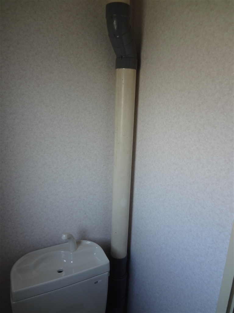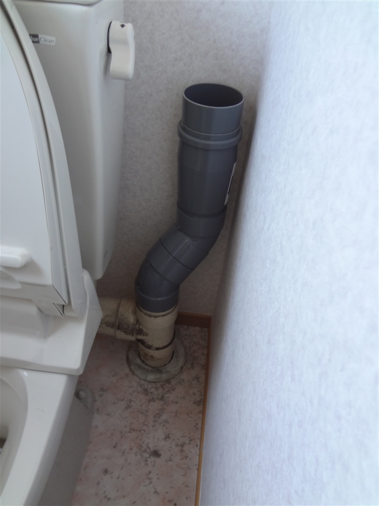 内装工事をしてトイレを設置します。また・・・排水管がトイレのタンクに干渉してしまいます。