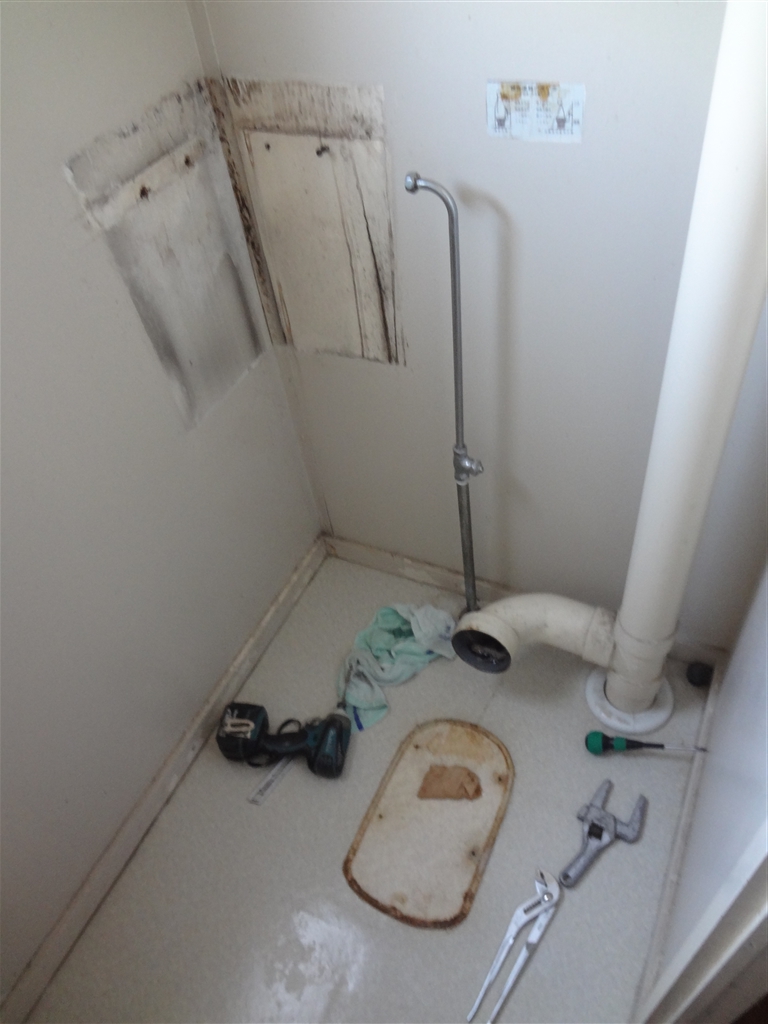 この部屋も排水管が傾いていたので、排水管を補修しながら工事を進めました。
