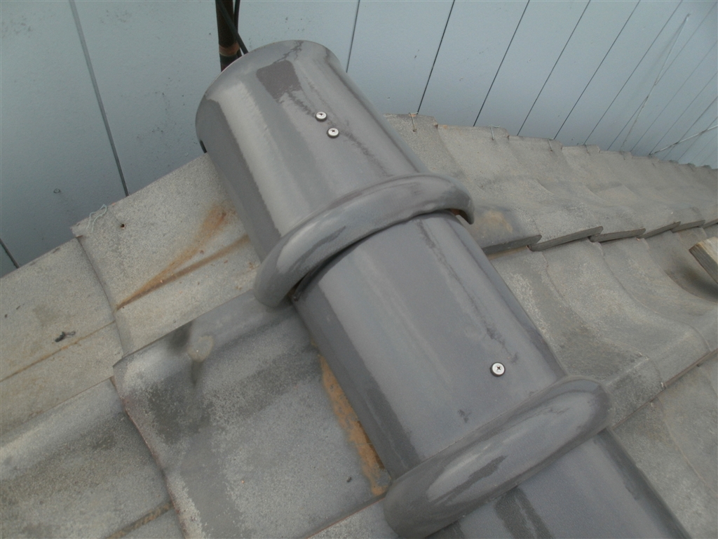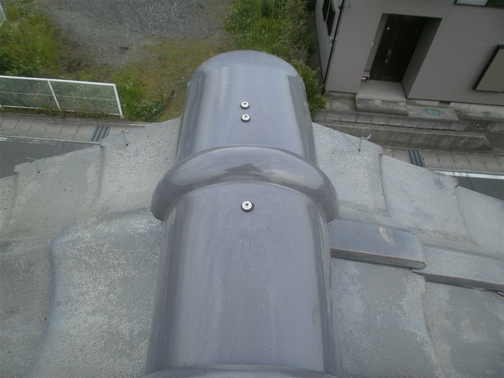 この現場では下から3段目まで「のし瓦」の部分を針金で数か所固定されていました。更にその上に残りの2段を置いてから・・・モルタルで冠瓦を固定していただけでした。