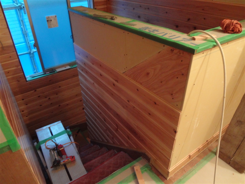 階段の上の部分までは、壁に杉の羽目板を貼りました。