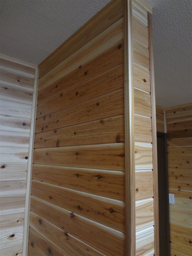 工事内容 新築 壁:杉羽目板貼り壁 + 天井 ダイケン クリアトーン + Panasonic製 Livie Realo シリーズ  クローゼット扉 レセンテ