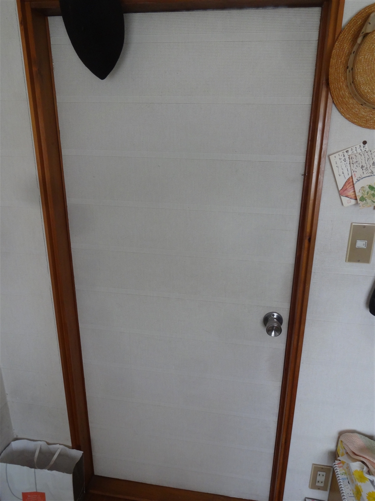 壁のクロスだけがきれいになってしまうと、入口の扉のクロスだけ色が違うので目立ってしまいます。そこで建具のクロスも貼替えることにしました。