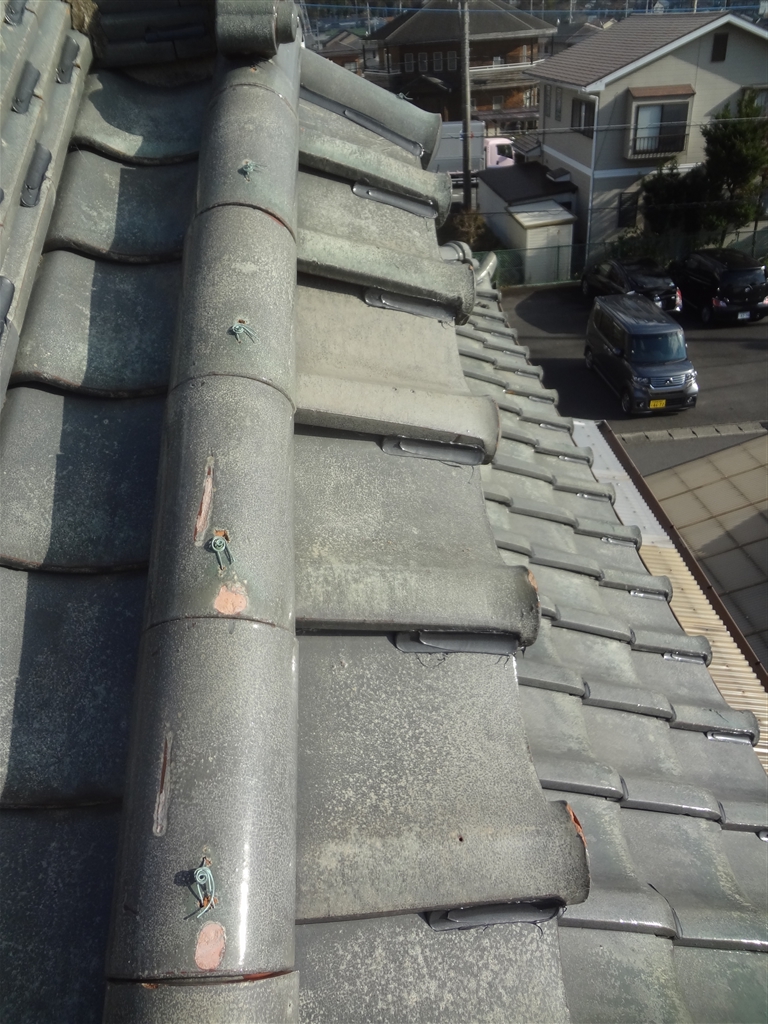 屋根が崩れないように!瓦ボンドロック施工 大屋根 風切り