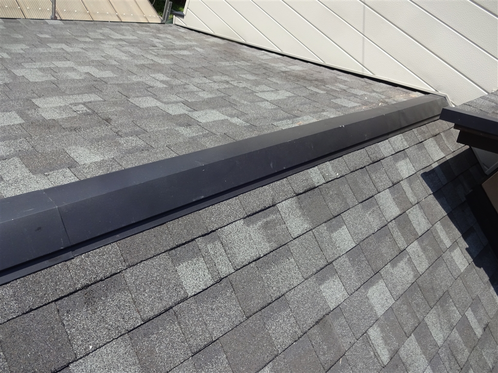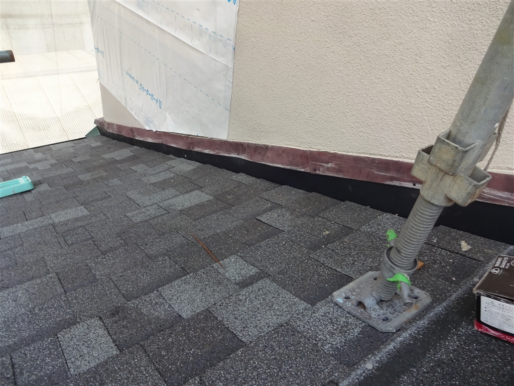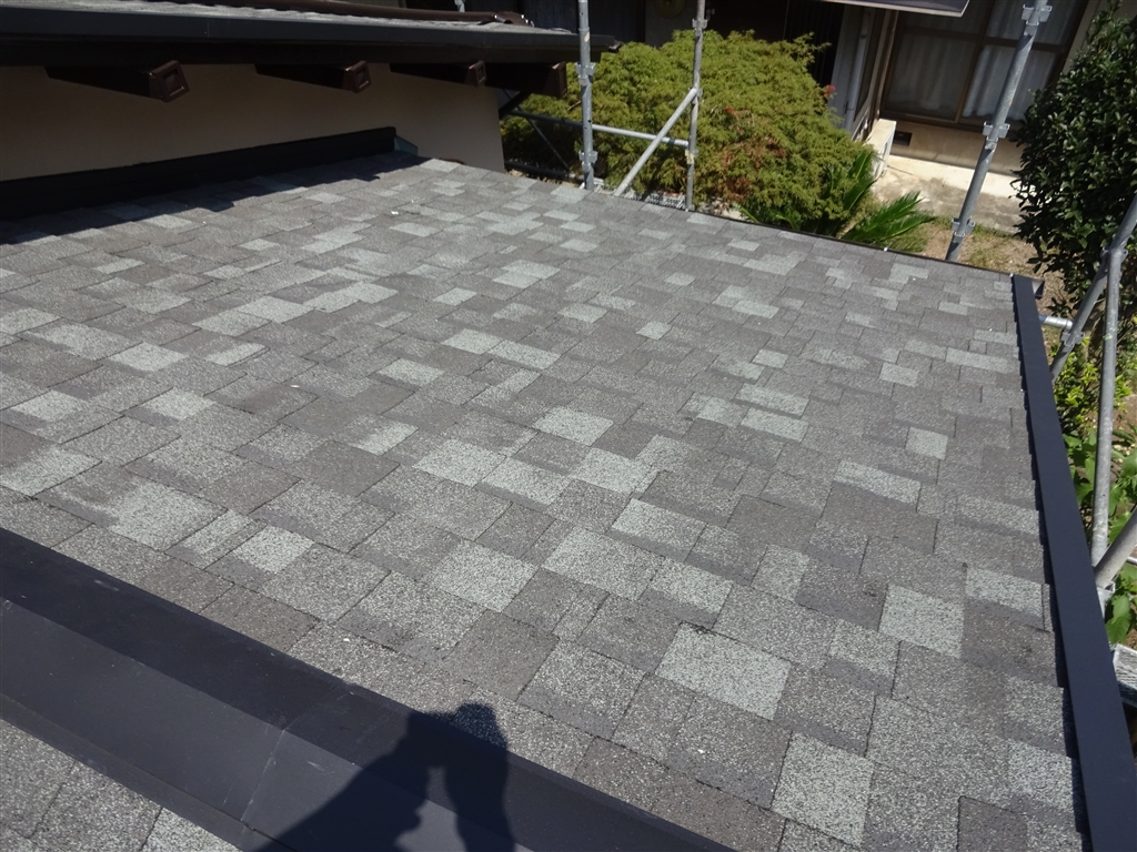 | 工事内容 | 瓦撤去 ⇒ 下地貼り ⇒ ファイバーグラスシングル屋根材 リッジウェイ葺き 色:デュアルブラック |