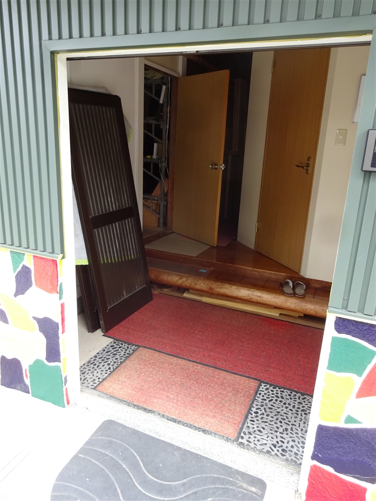 52年前に祖父が建てたこの家を、10年前に譲り受けました。が・・・漏水が酷くて何度も補修を繰り返してきました。そんな中、この場所で6年前に英会話教室を妹が開くことになったので、ある程度は教室らしく改装工事を実施してきました。ところが・・・またしても30年前に増築した2Fのトイレからと、教室の廊下から雨漏りをしてくるようになりました。これはタマッたもんじゃありません。ただ、多くの方に来ていただいている教室なので、しっかりと補修することにしました。外装・内装共に英会話教室らしく改装していきます。この玄関扉は私が子供の時に自転車を当てて、ヒビをいれました!35年後に自分が取替えることになるとは・・・自分のせいで生徒さん達にケガさせるわけにもいかないので・・・