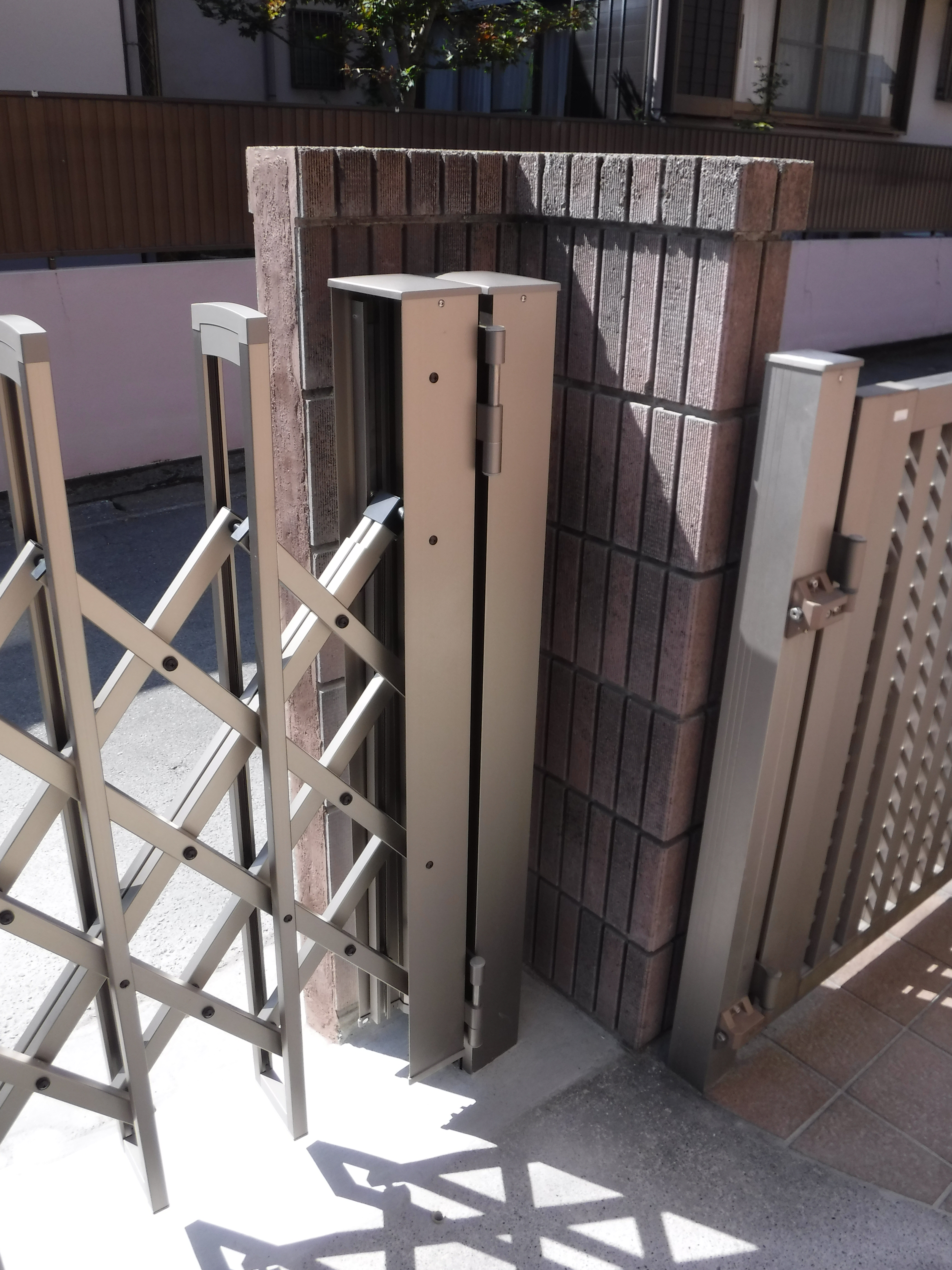 | 工事内容 | 駐車場 塀 ⇒ 一部撤去 + 補修 ⇒ LIXIL製 アルシャインⅡ H型A ノンレールタイプ設置 |