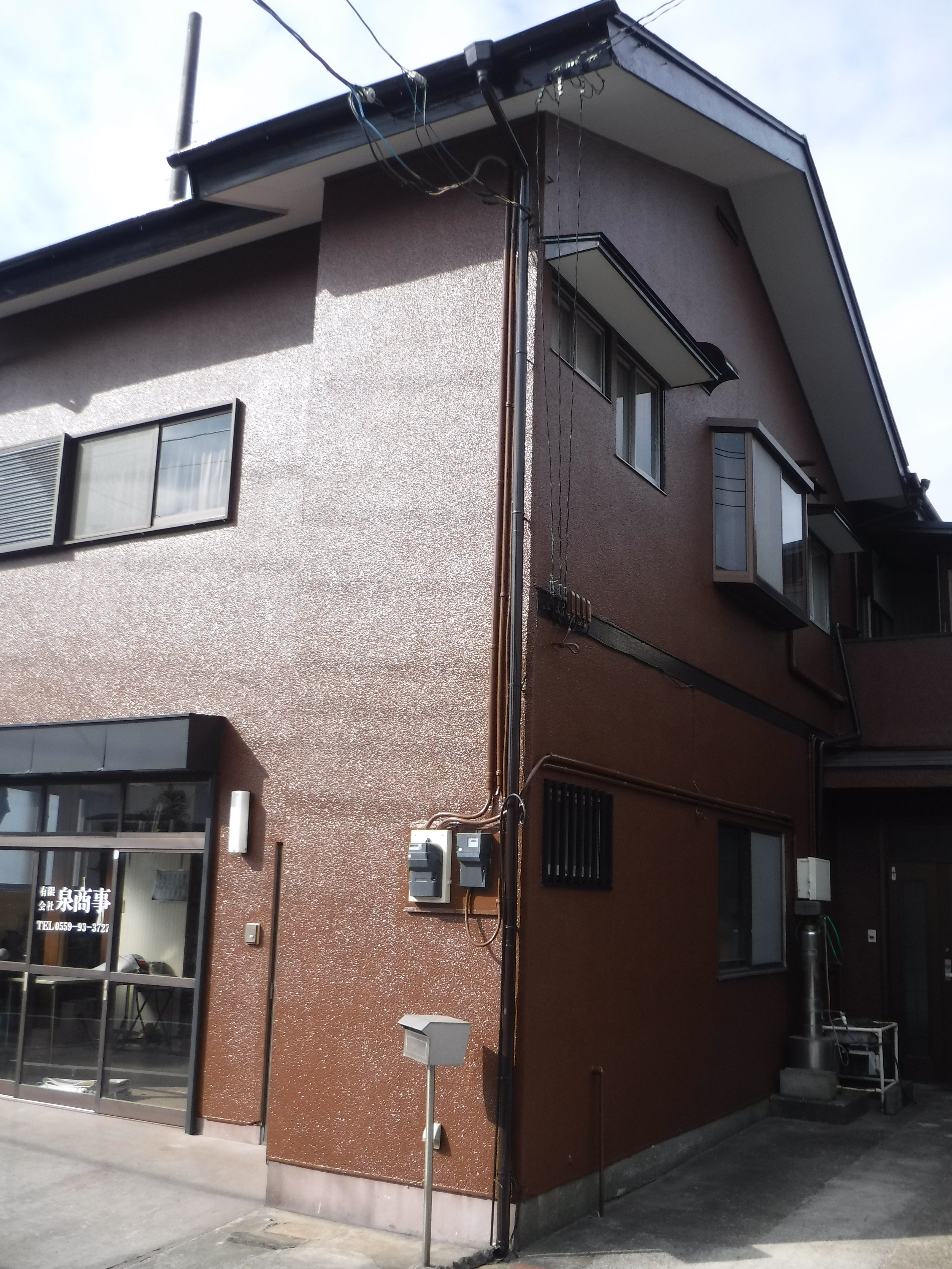 2018年9月30日の台風24号で屋根が瓦屋根が吹き飛ばされました!雨漏りもしてきたみたいで・・・軒天もどこかに飛ばされていきました。保険を活用して補修をお願いします。うちの工場は増築を2回繰り返していて、変則的に繋がっております。他の部分も実費で補修したいと思います。この機会に外装を全部補修・改装しておこうと思います。ここの部分が飛んで無くなったことによって、屋根の被害にも気付きました。言ってみればココが今回の工事のキッカケになります。
